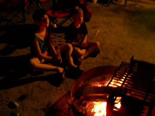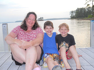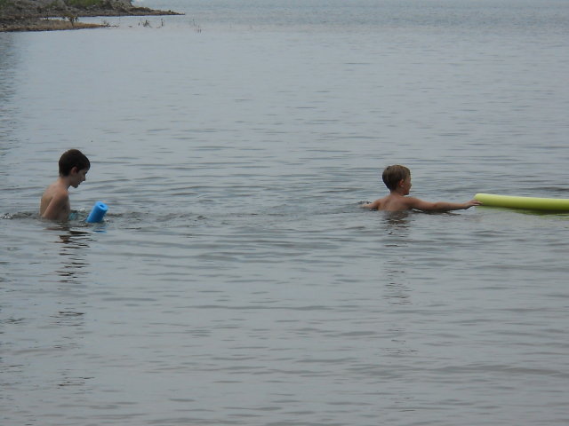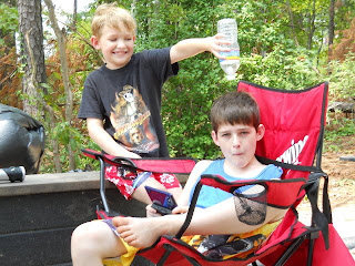 We were fortunate enough to join our friends Pat & Jan at their camp so we didn't have to supply or set much up. We brought food & chairs - and bug spray!! (I just got done itching from flea bites, I didn't want to add any mosquito bites!) Of course, the first (and about only) thing the boys wanted to do was go swimming. I think they got their fill of it for a little while. It was great that neither of them needs floaties to swim anymore! (Thank you cousin, Danny!)