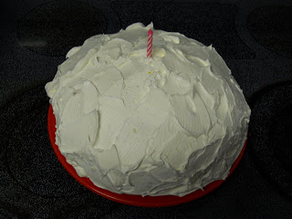 He must love me an awful lot to make this cake - he had to back two 8" rounds and cut them in half and put layers of fruit in between. It wasn't the prettiest thing (but I think before it was cut, it was beautiful!) but it tastes yummy!!